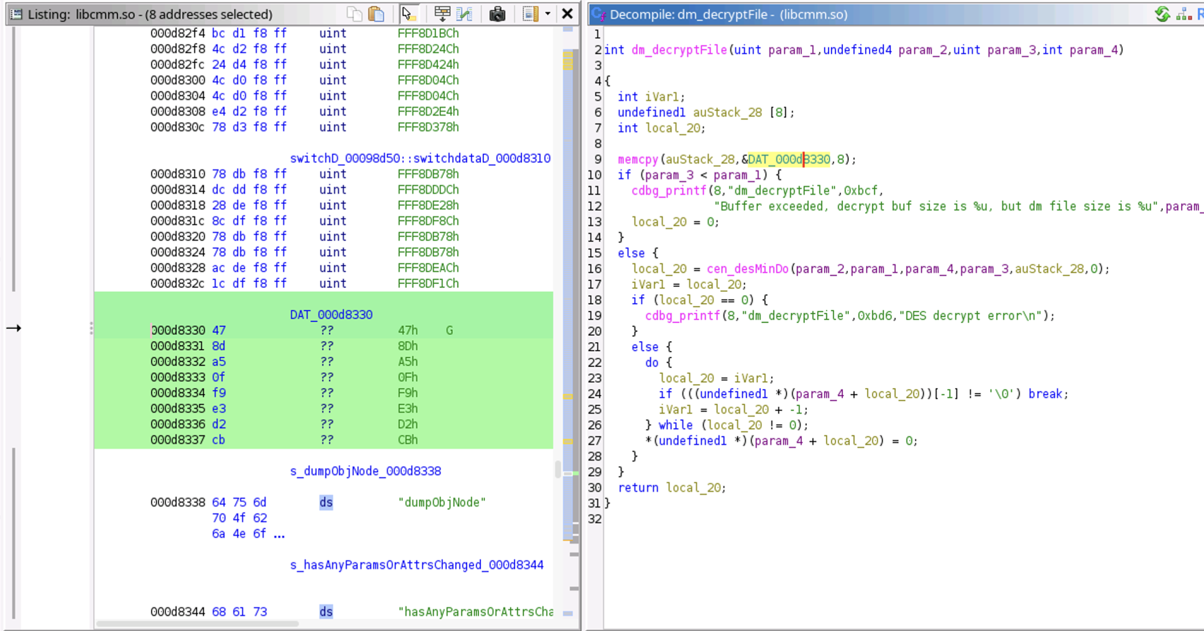 After decompiling with Ghidra and searching for the string ‘default_config.xml,’ I cross-referenced and inspected the function calls, eventually identifying a function, dm_decryptFile, which uses a hardcoded key in memory to decrypt XML files.